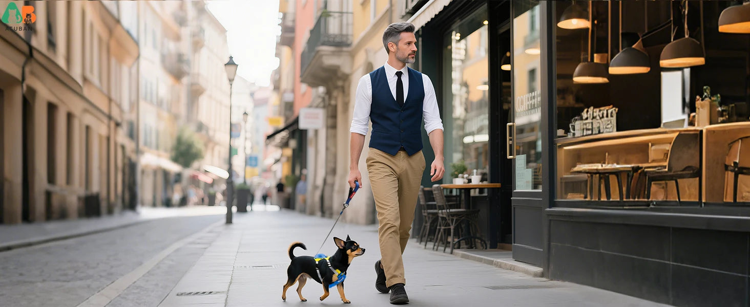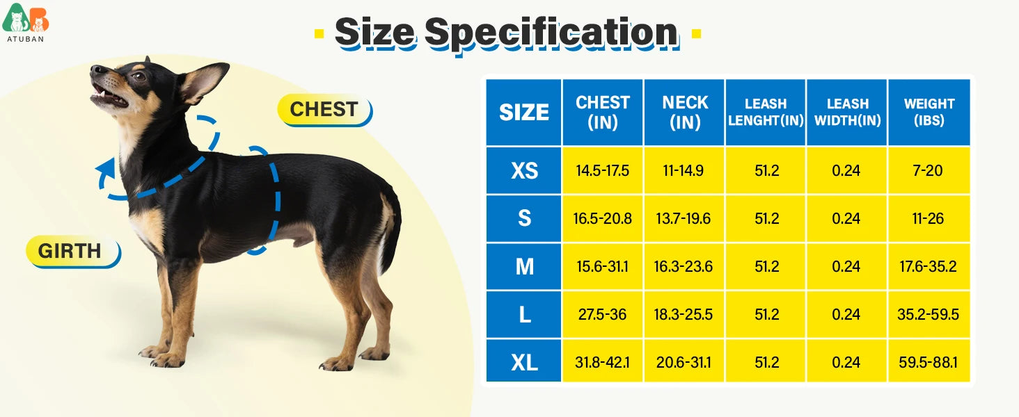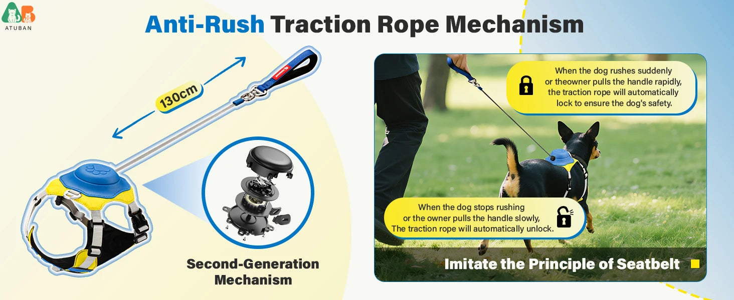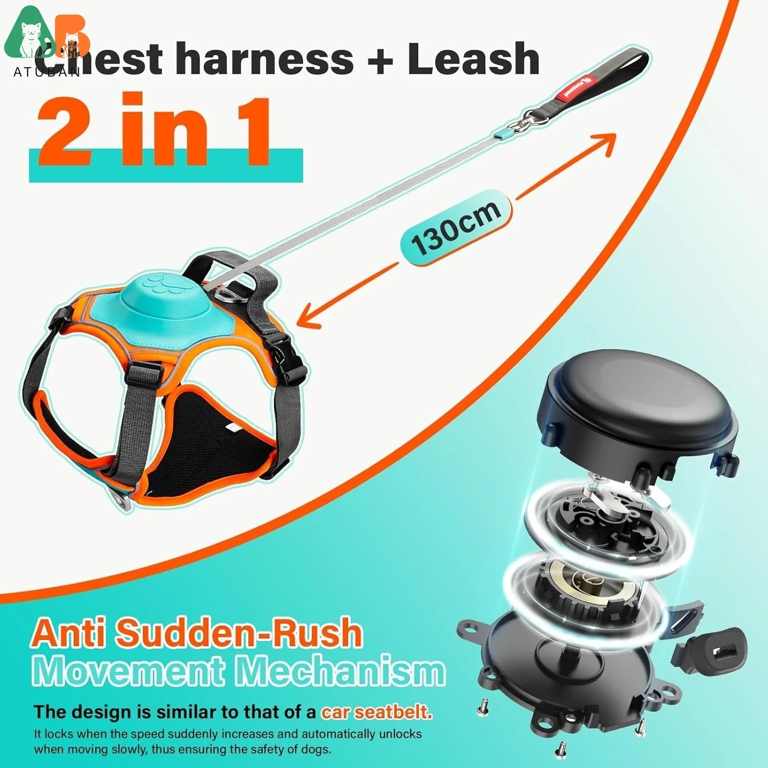 No Pull Auto-Retractable Leash: 2-in-1 Dog Harness & Leash. Built-in retractable leash extends up to 1.3m. Car seatbelt-inspired designWhen the dog suddenly accelerates, the owner pulling the leash quickly triggers the internal mechanism to auto-lock the leash length ; unlocks when owner pulls slowly.When the leash is in the retracted state, it frees the owner's hands, allowing the dog to play freely.